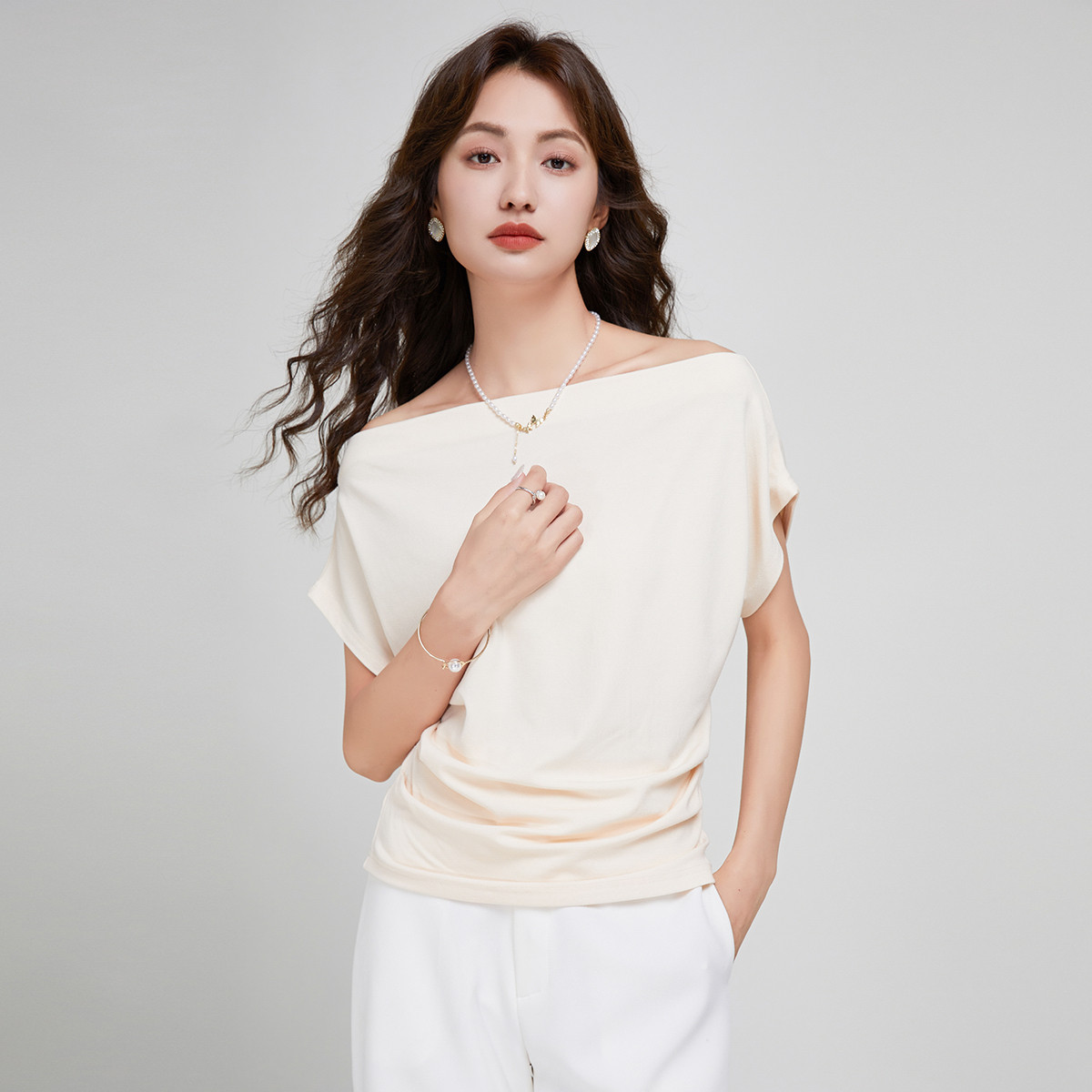 高级感纯色一字领t恤女夏季法式设计斜肩露锁骨气质显瘦上衣 957464