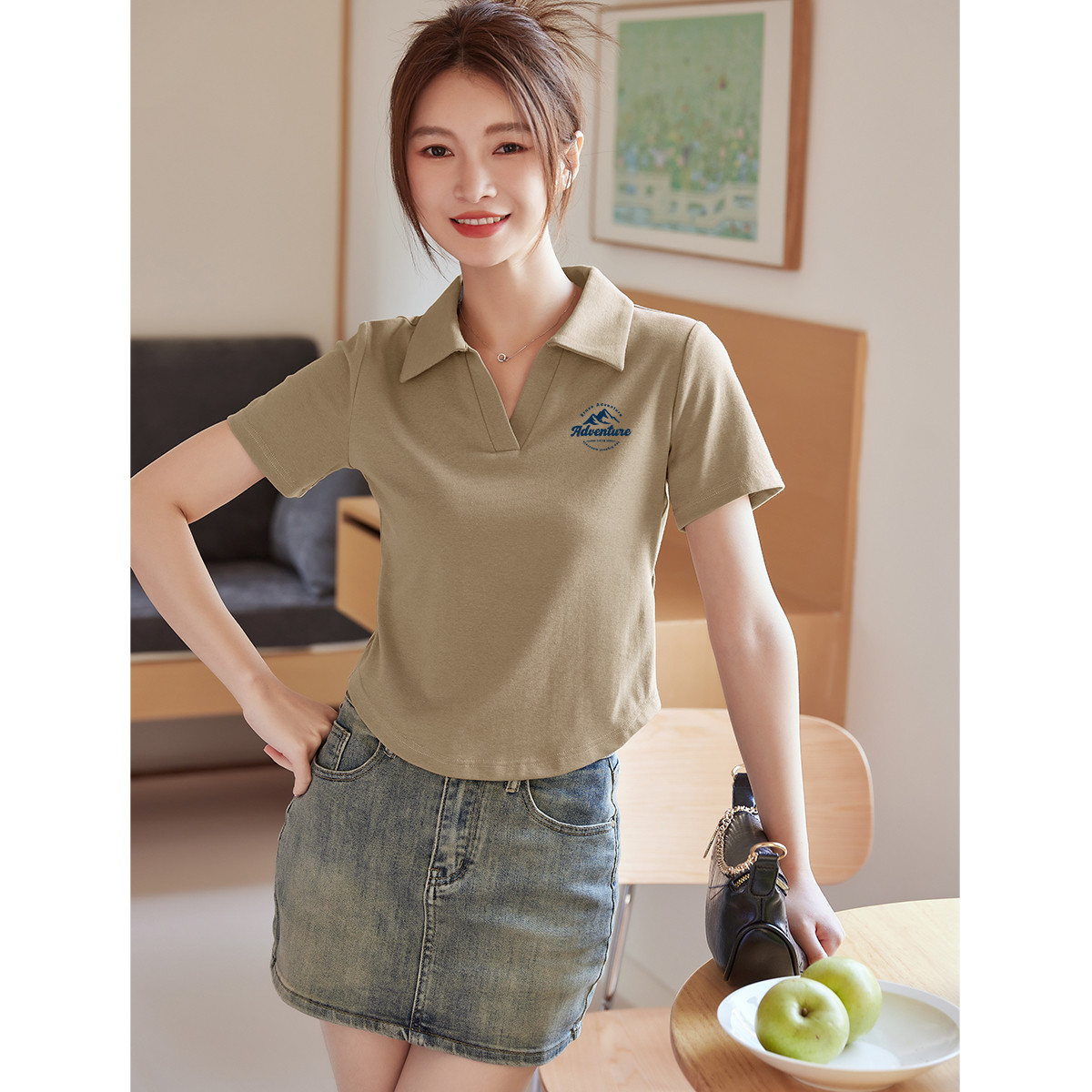 米子旗夏季POLO领印花女式T恤弧形下摆短款修身正肩短袖上衣 372186