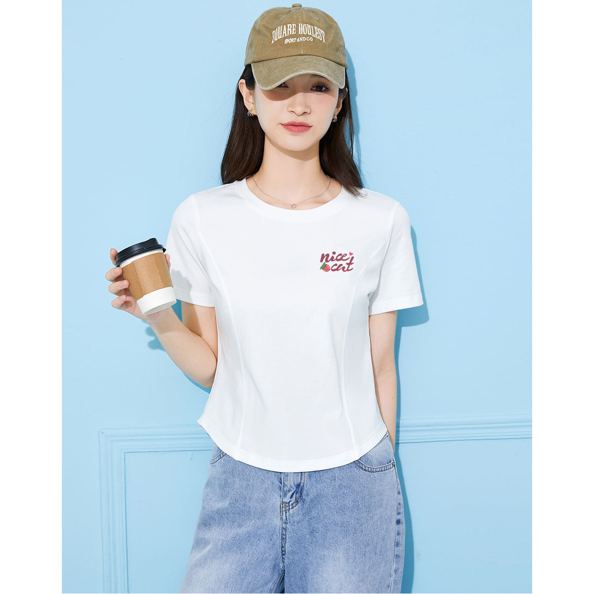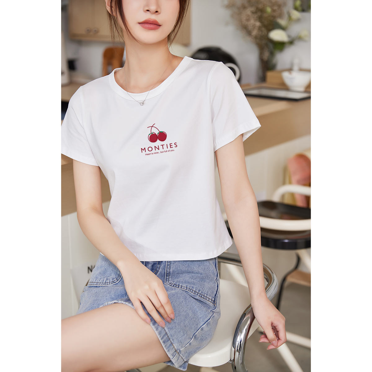 米子旗夏季圆领樱桃印花T恤女短款修身简约短袖上衣 010778
