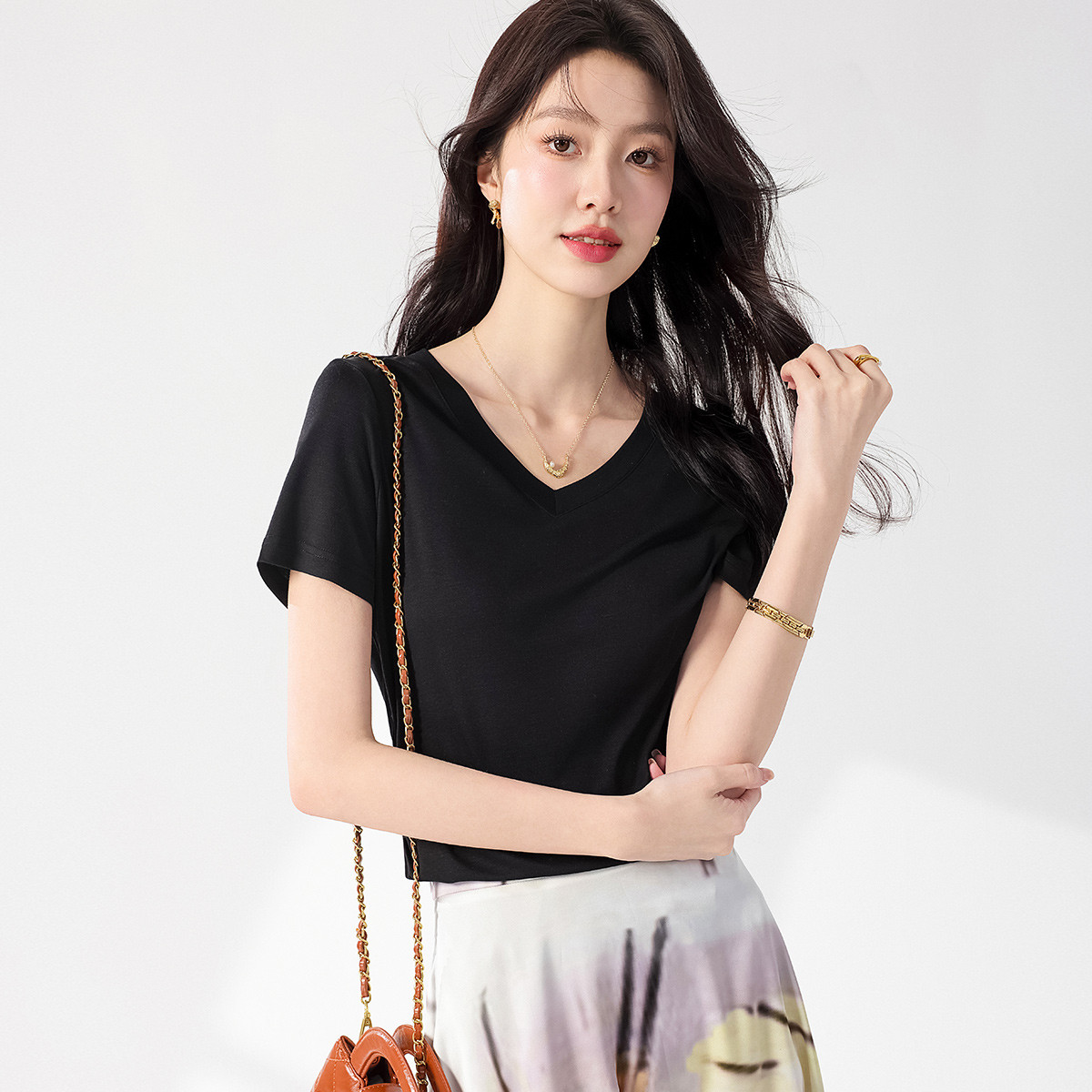 春夏轻薄透气简约百搭纯色打底衫含桑蚕丝V领短袖T恤 628307