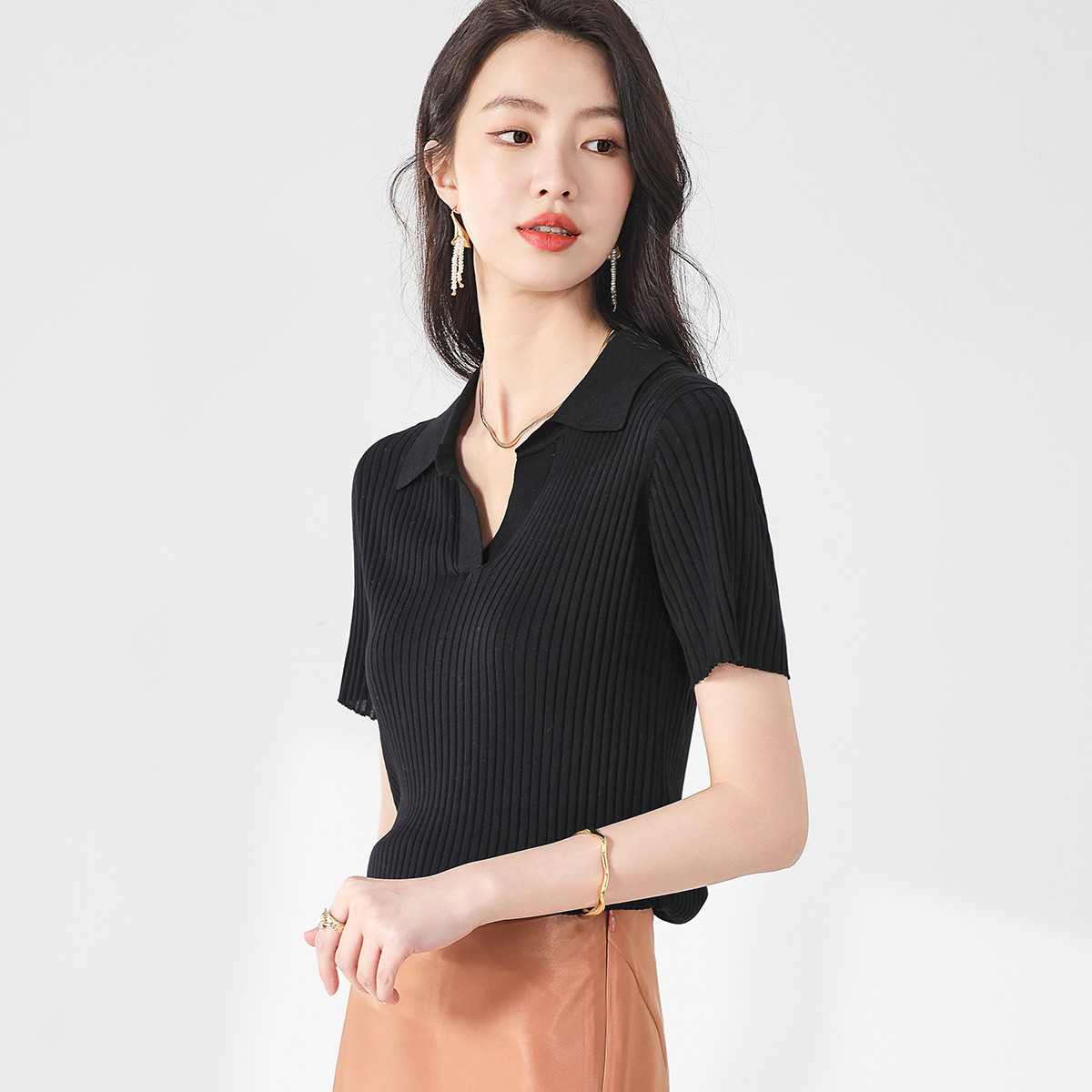 纯色百搭翻领含桑蚕丝针织打底衫短袖T恤轻薄透气 113043