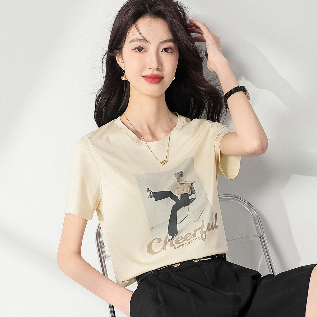 【含桑蚕丝】轻薄透气趣味印花圆领短袖T恤打底衫上衣 036627