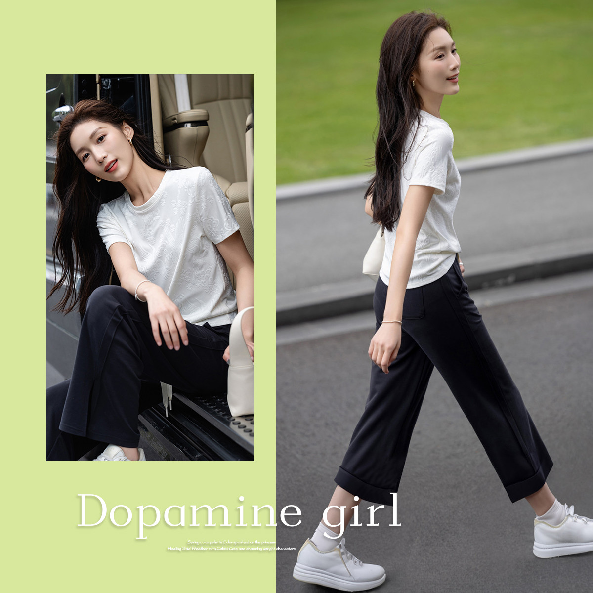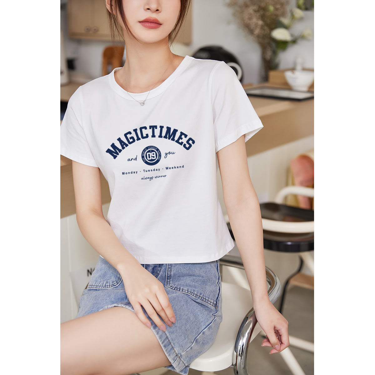 米子旗夏季圆领字母印花女式T恤短款修身减龄小个子短袖上衣 732698