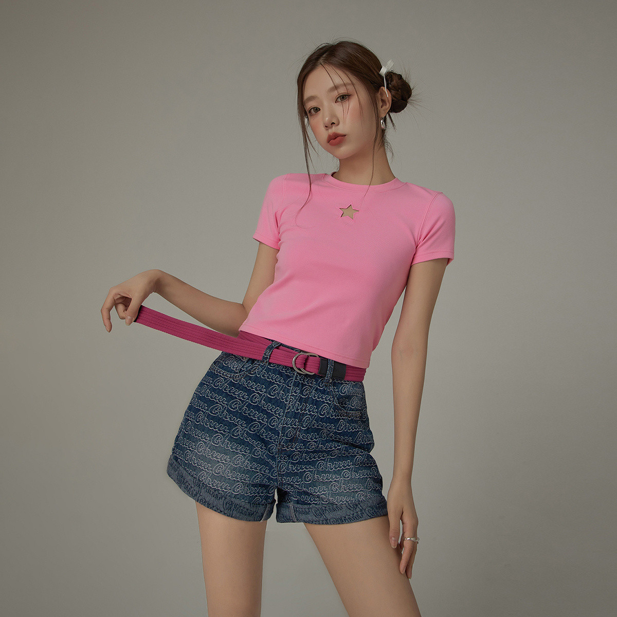 星星镂空T恤女春夏后背印花圆领短袖短上衣 053843