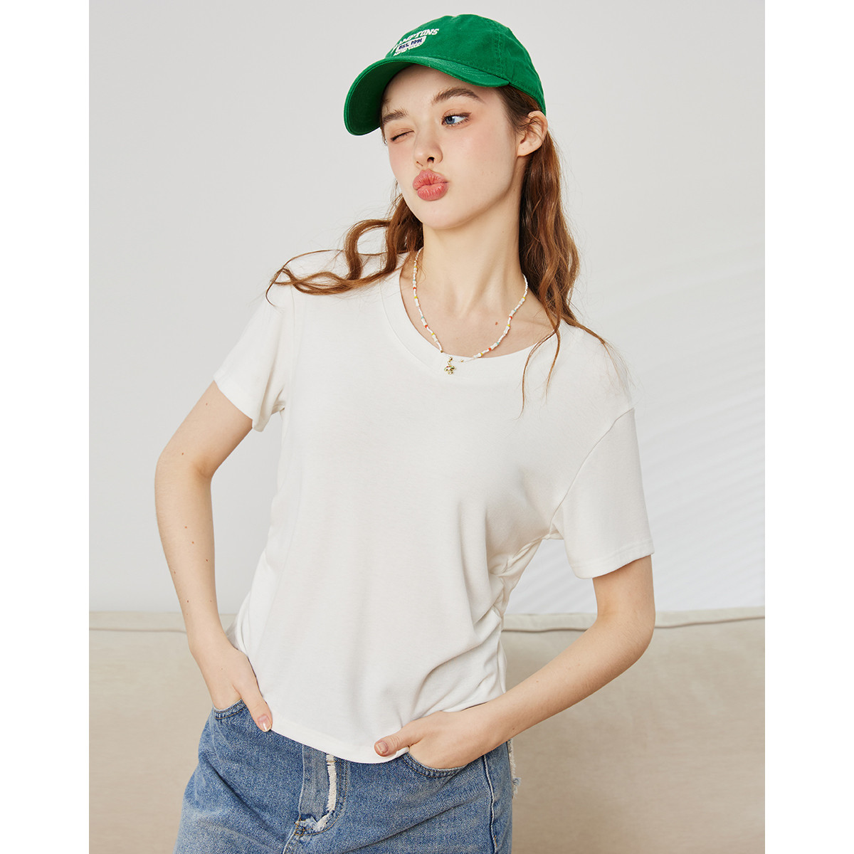 米子旗夏季圆领印花女式T恤弧形下摆设计短款修身显瘦短袖上衣 640666