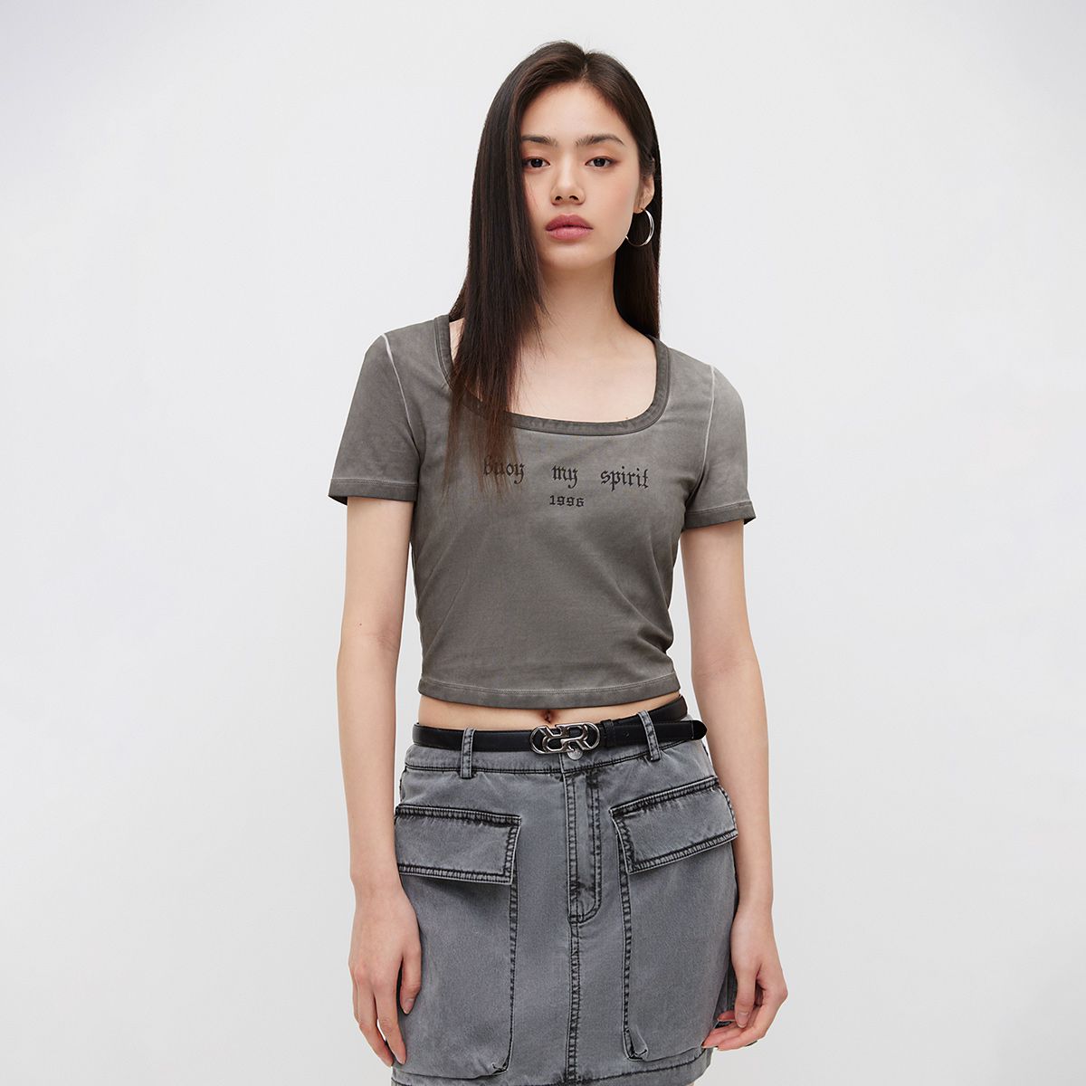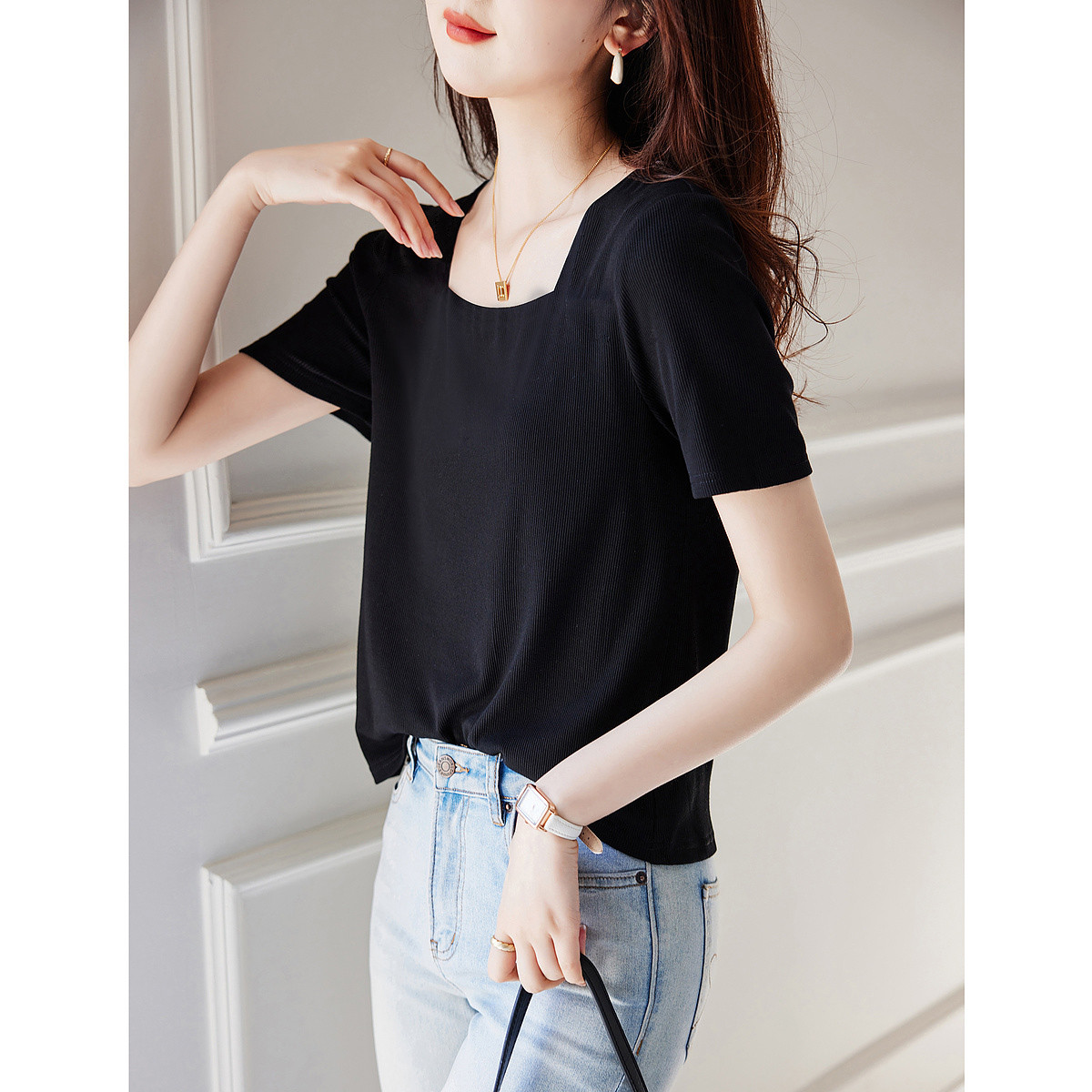 【休闲百搭】夏季复古字母方领修身短袖T恤女 626138