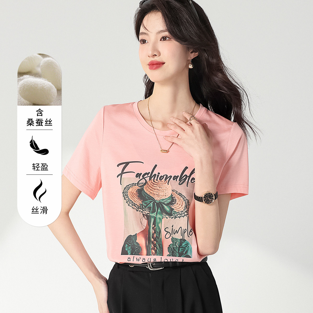 【含桑蚕丝】轻薄透气趣味印花圆领短袖T恤打底衫上衣女夏 069395