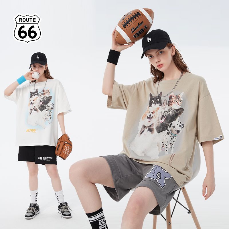 66号公路/ROUTE66 美式潮牌短袖T恤男女同款猫狗图案休闲宽松体恤