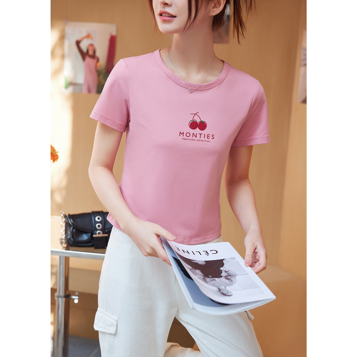 米子旗夏季圆领樱桃印花T恤女短款修身简约短袖上衣 994394