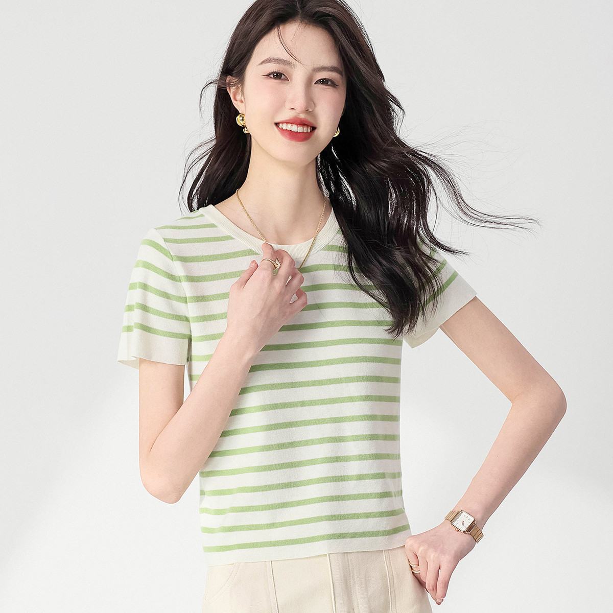【含桑蚕丝】透气圆领经典条纹针织打底衫短袖T恤 921363