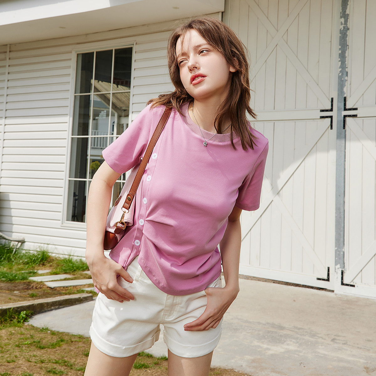 侧边抽褶收腰设计短袖上衣夏季遮肉显瘦休闲个性女式T恤 308061