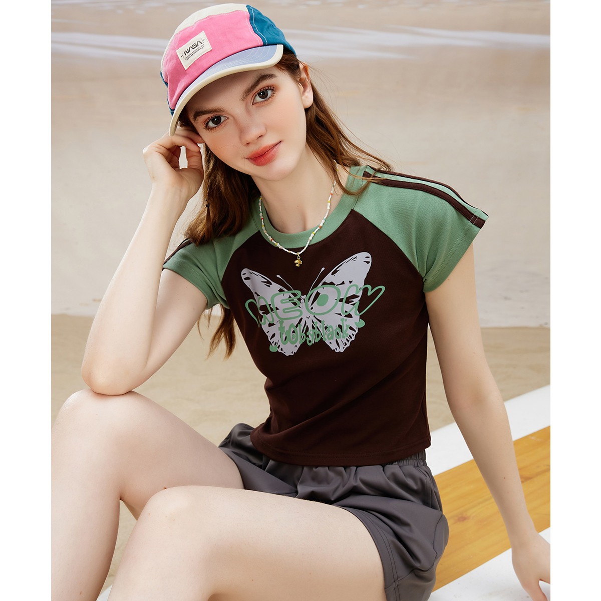 网纱印花蝴蝶个性设计撞色女式T恤夏季修身短款圆领上衣 294685
