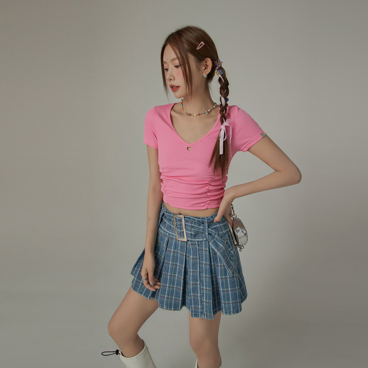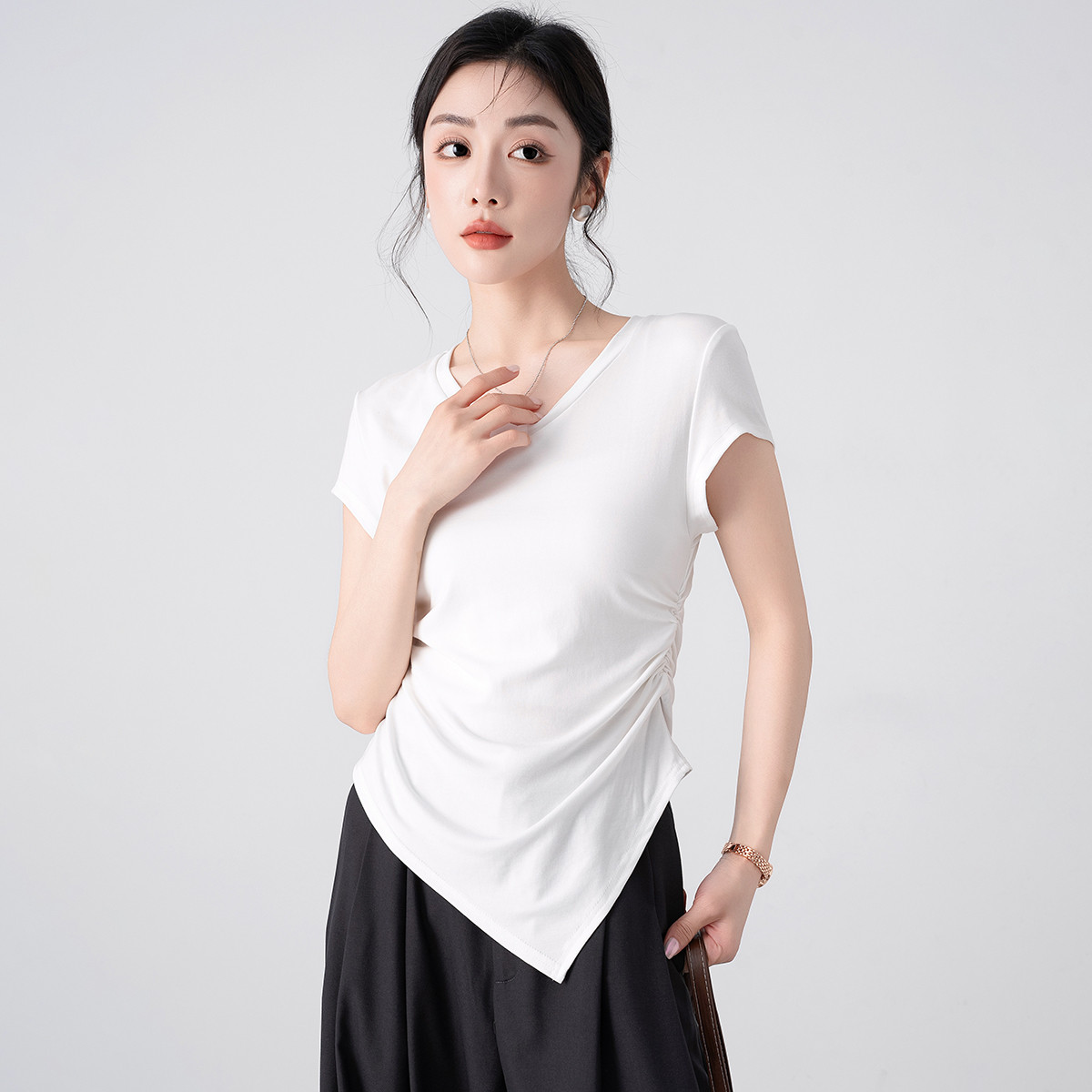 纯色v领正肩短袖T恤女夏季不规则弧形下摆褶皱收腰修身辣妹上衣 269144