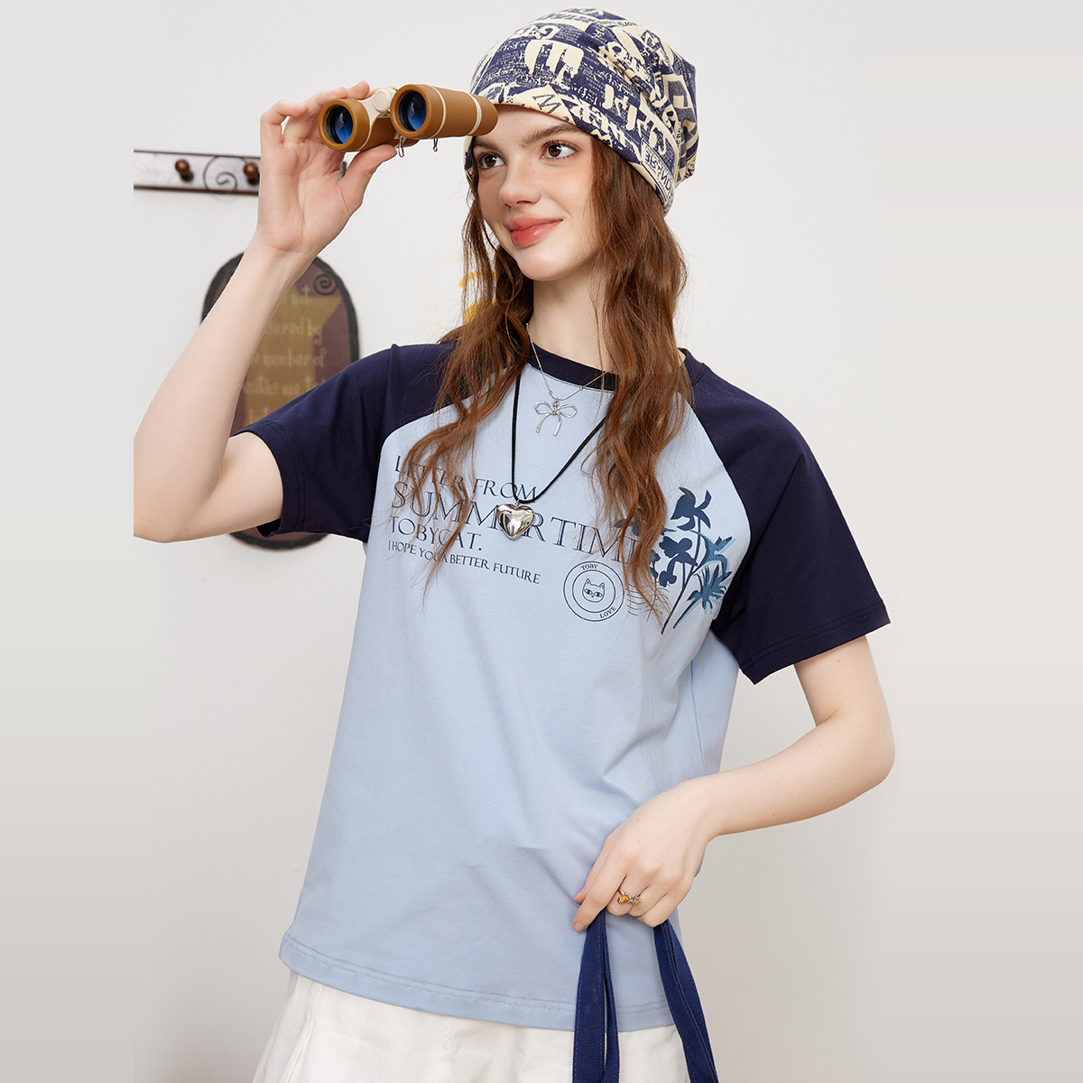 印花插肩袖复古显瘦短袖上衣夏季休闲小清新圆领女式T恤 420125
