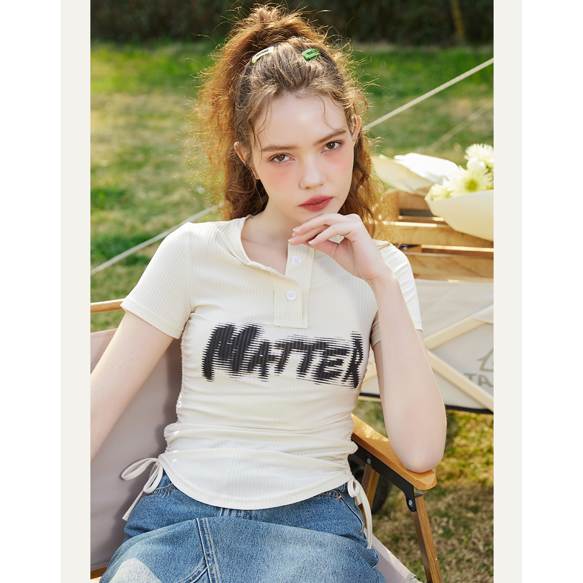 复古辣妹风抽绳设计正肩女式T恤夏季新修身显瘦短袖上衣 092829