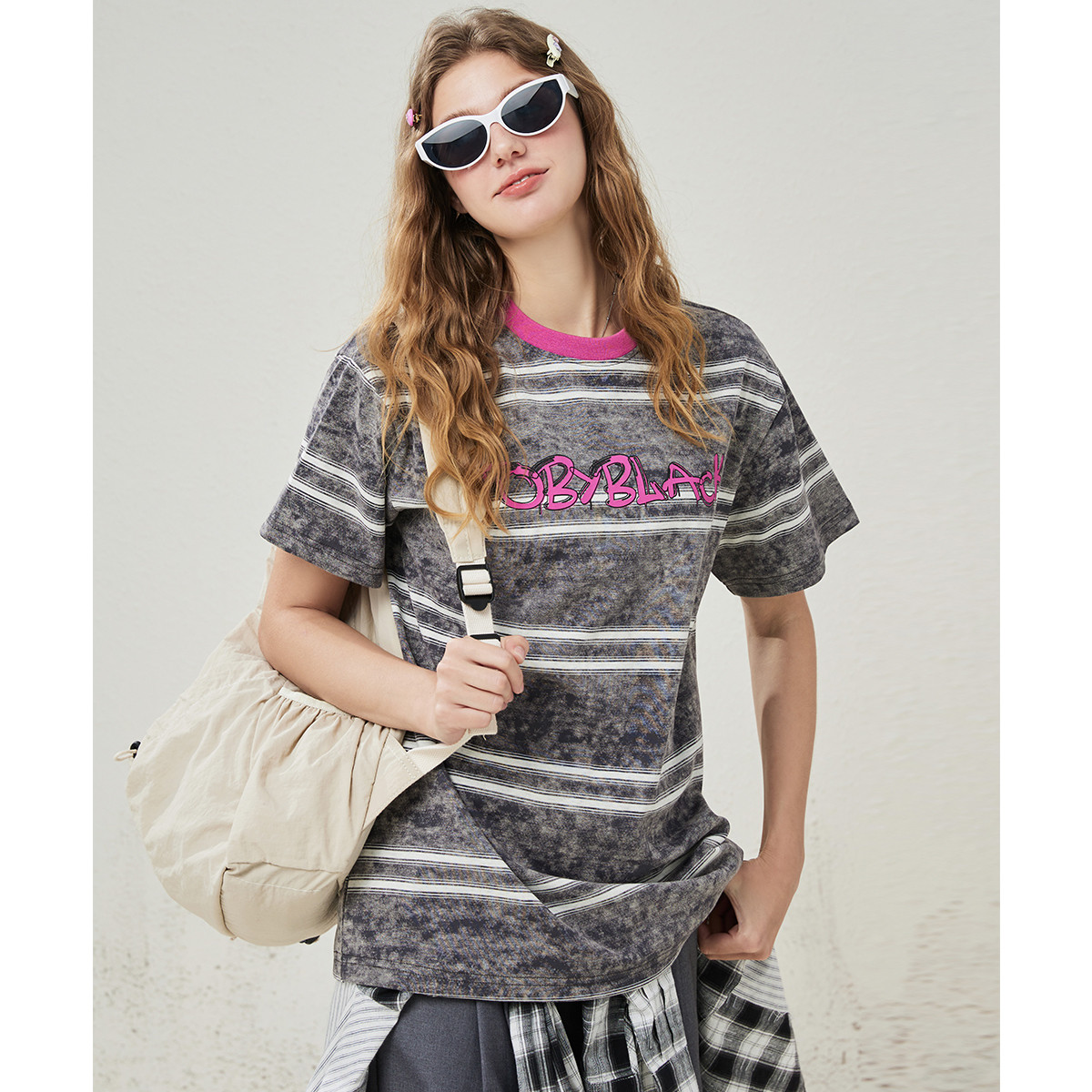 美式复古条纹做旧设计潮牌撞色短袖夏季休闲个性女式T恤 346333