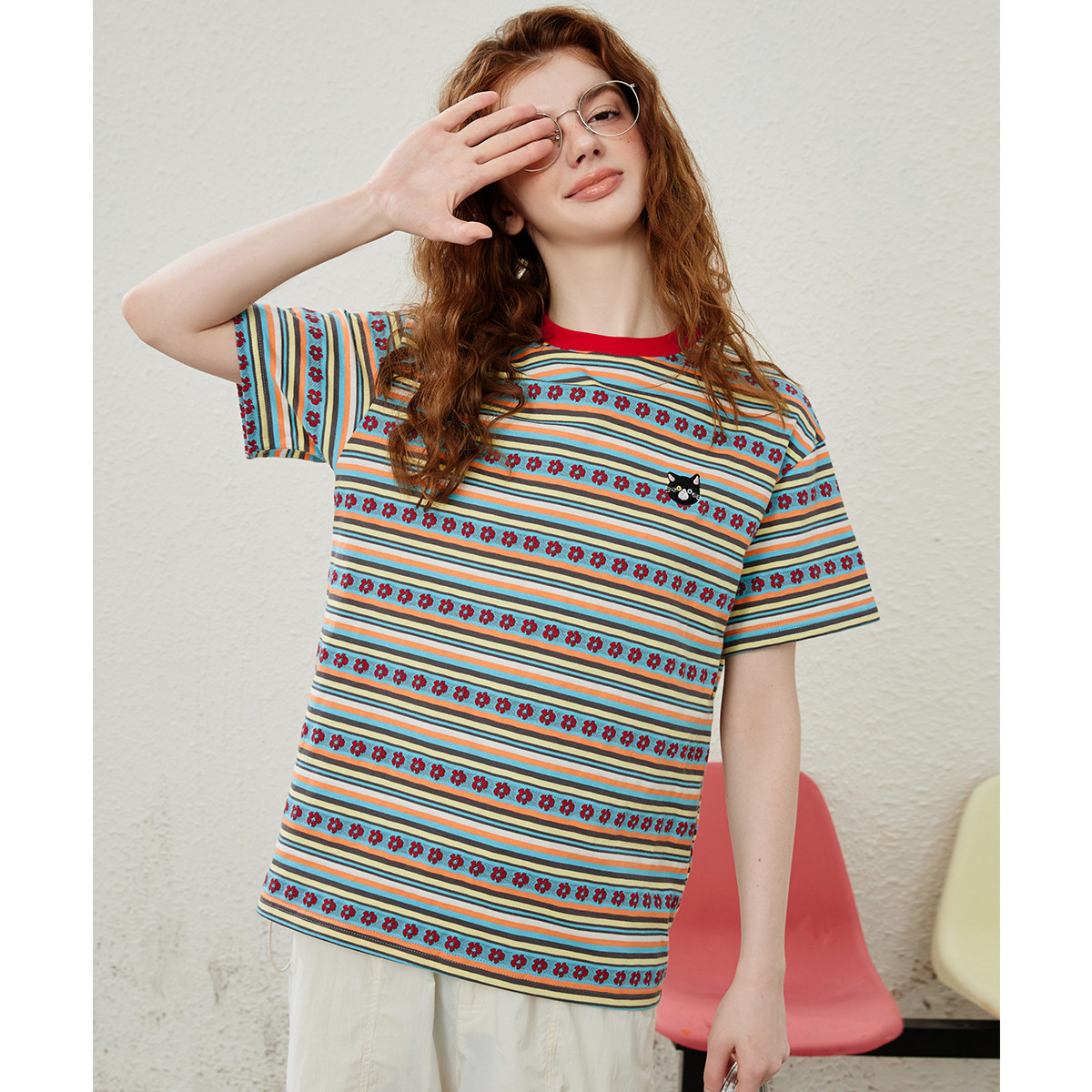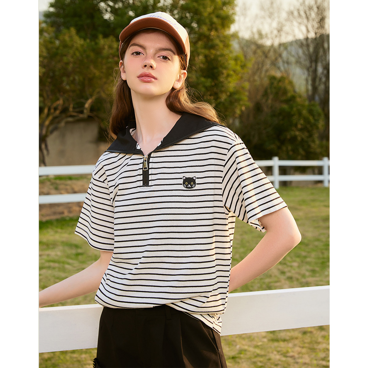 撞色拼接条纹设计短袖上衣夏季猫头刺绣休闲百搭女式T恤 303965