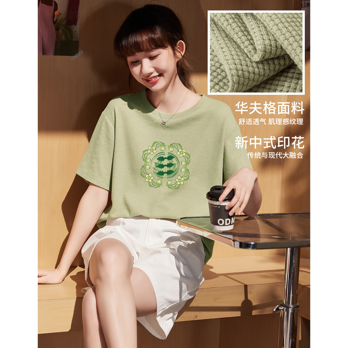 米子旗夏季圆领新中式印花T恤女华夫格宽松休闲减龄短袖上衣 959322