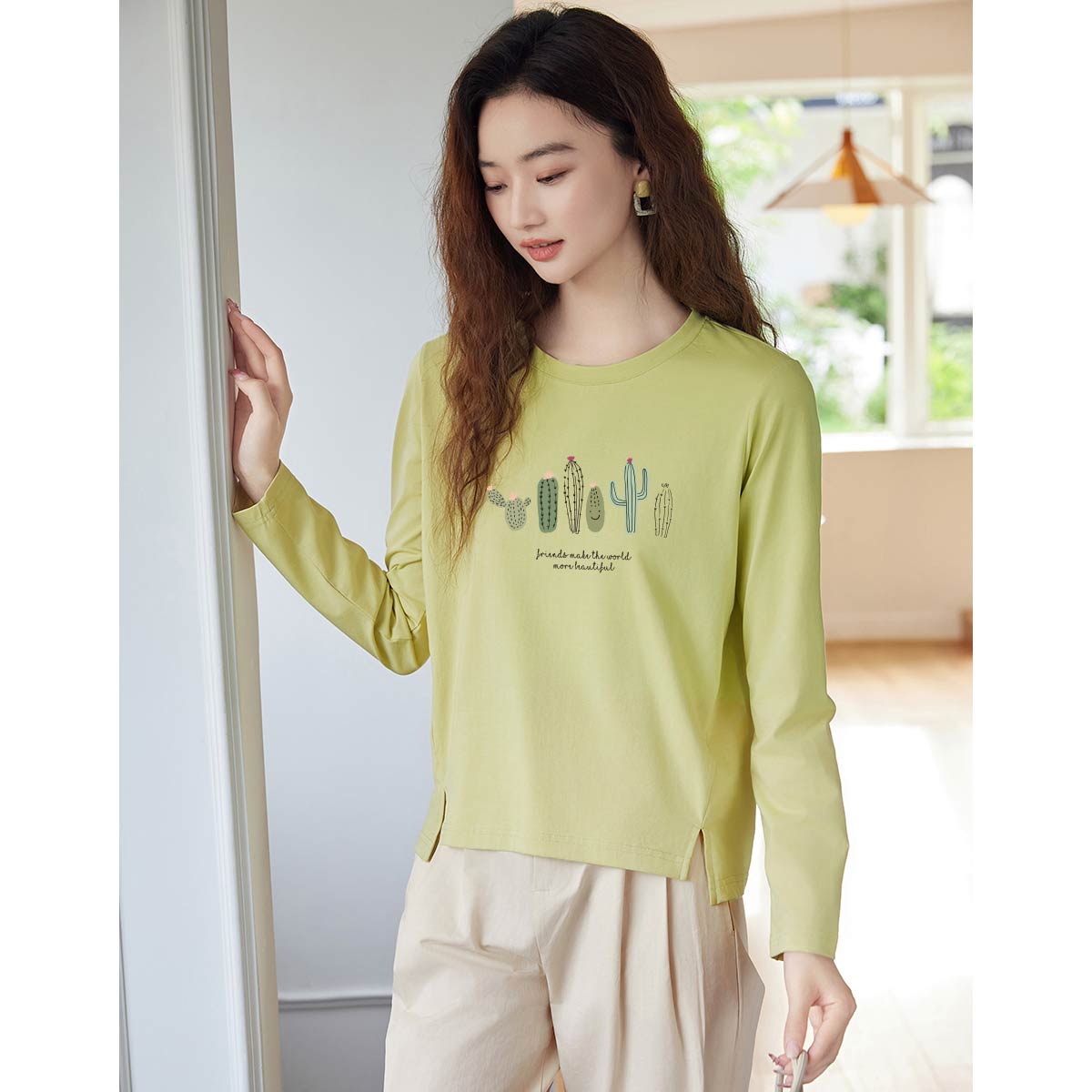 米子旗春秋季圆领仙人掌印花T恤女侧边开叉宽松休闲长袖上衣 965274