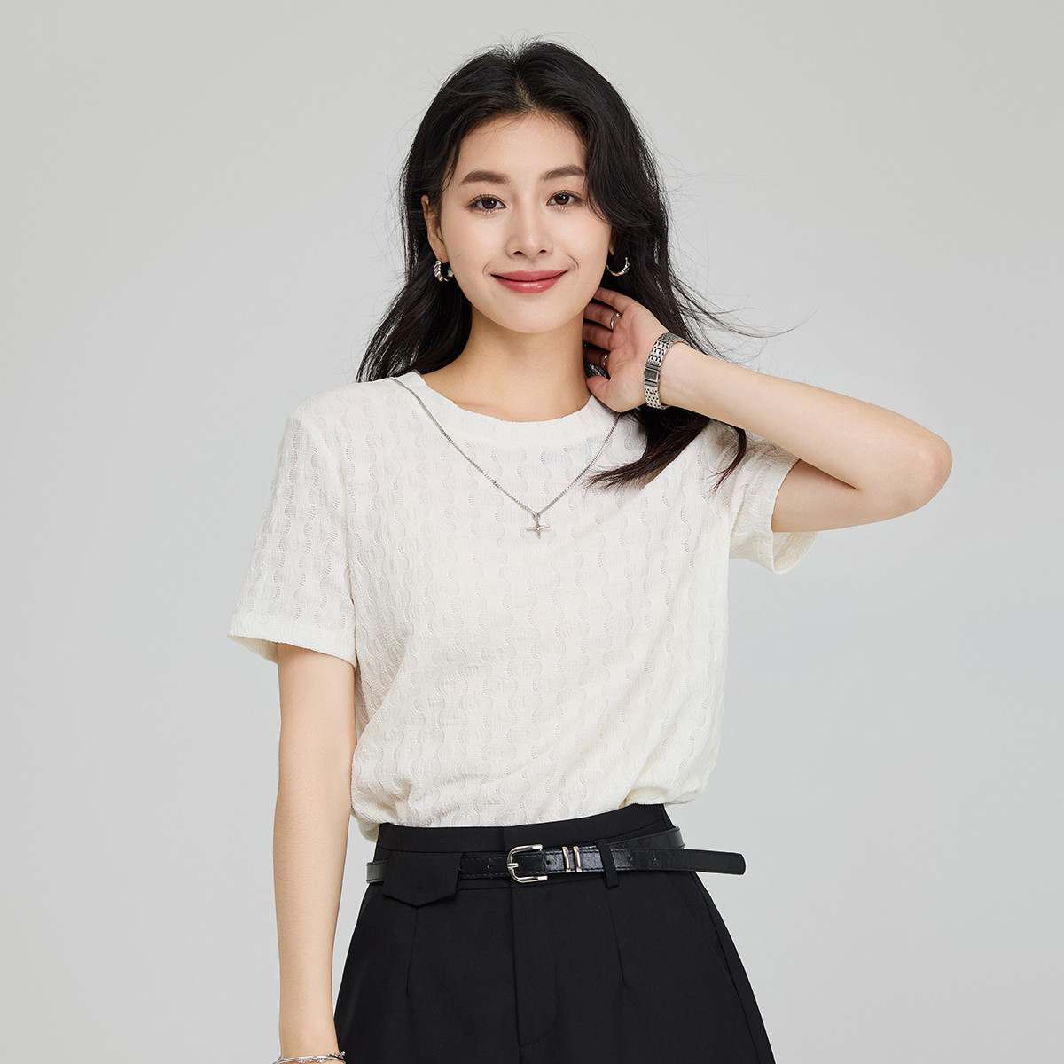 短袖t恤女款夏季宽松简约设计感链条圆领上衣 690776
