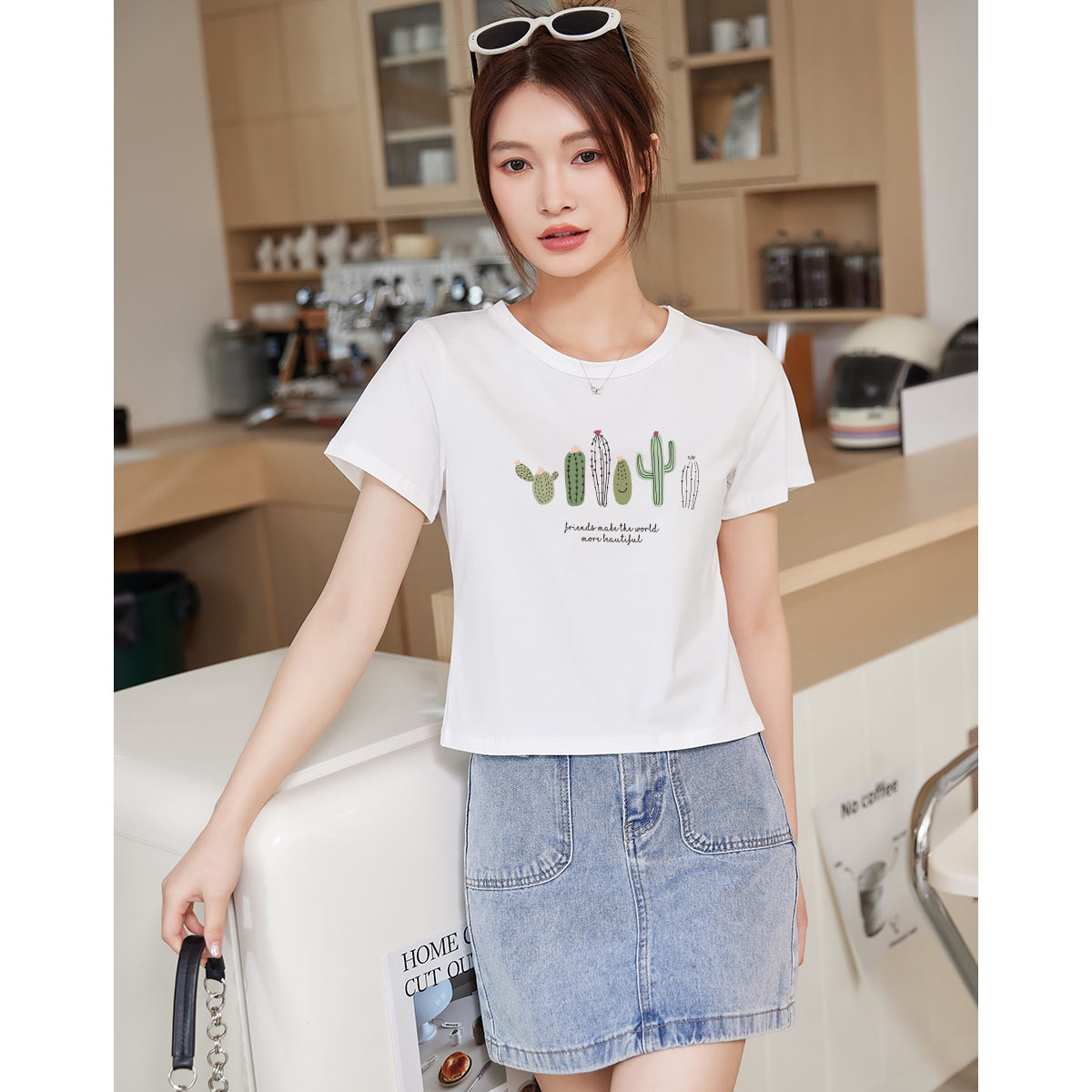 米子旗夏季圆领仙人掌印花T恤女修身短款简约时尚短袖上衣 054234