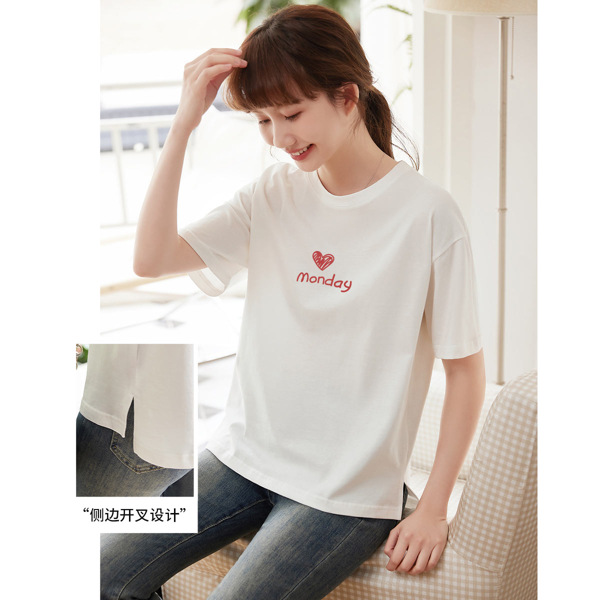 米子旗夏季女圆领字母印花大码T恤侧边开叉设计宽松短袖上衣 106330