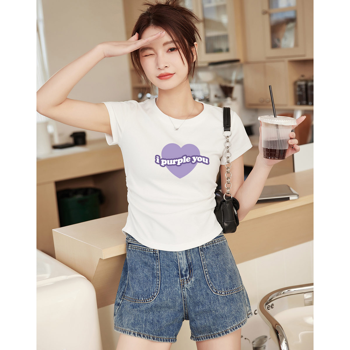 米子旗夏季圆领爱心印花T恤女侧边褶皱设计短款修身短袖上衣 472090