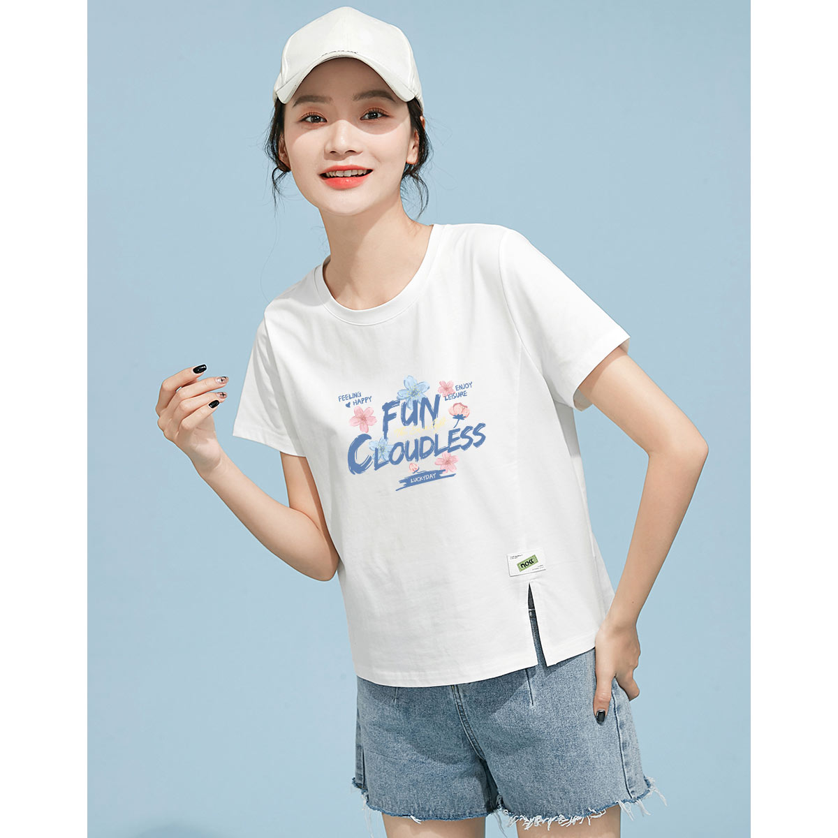 米子旗夏季圆领创意印花基础款T恤下摆开叉设计短款宽松短袖上衣 390170