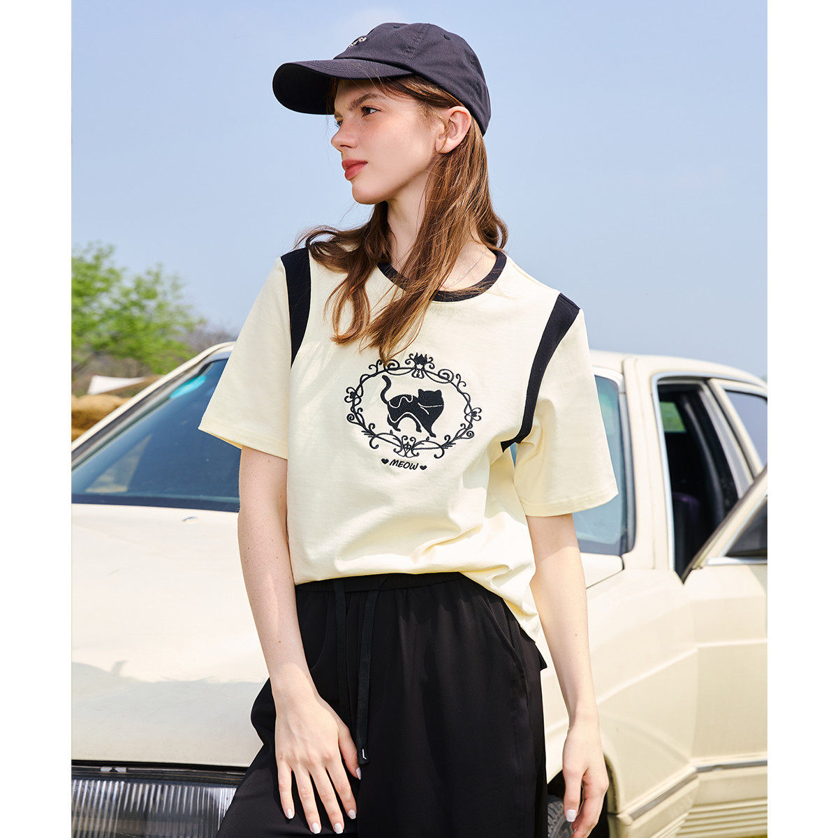 【复古情怀】夏季圆领条纹撞色短袖t恤女刺绣时髦舒适女式t恤 912065