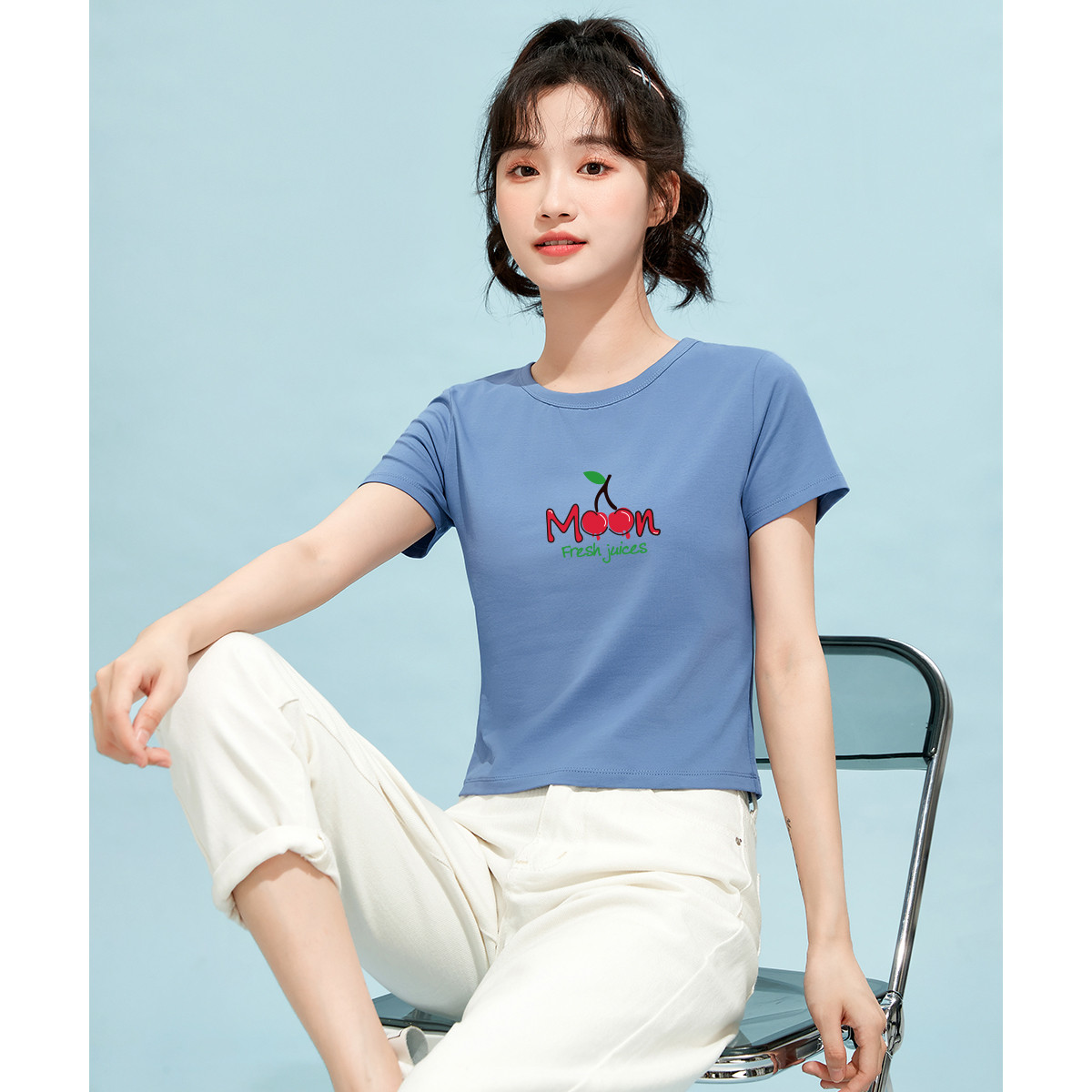 米子旗夏季款圆领女式T恤樱桃印花修身短款短袖上衣女 227610