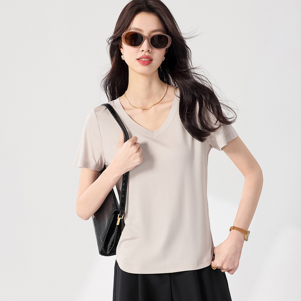 春夏轻薄透气简约百搭纯色打底衫含桑蚕丝V领短袖T恤 656979