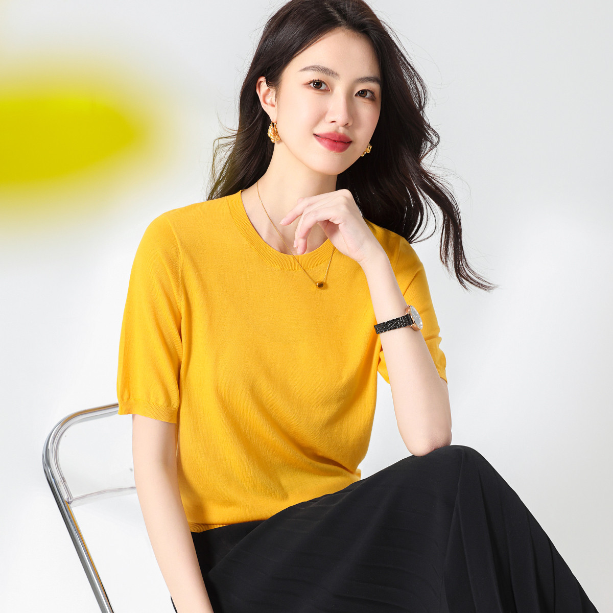 【含桑蚕丝】轻薄透气基础百搭纯色圆领针织打底衫短袖T恤女夏 280979