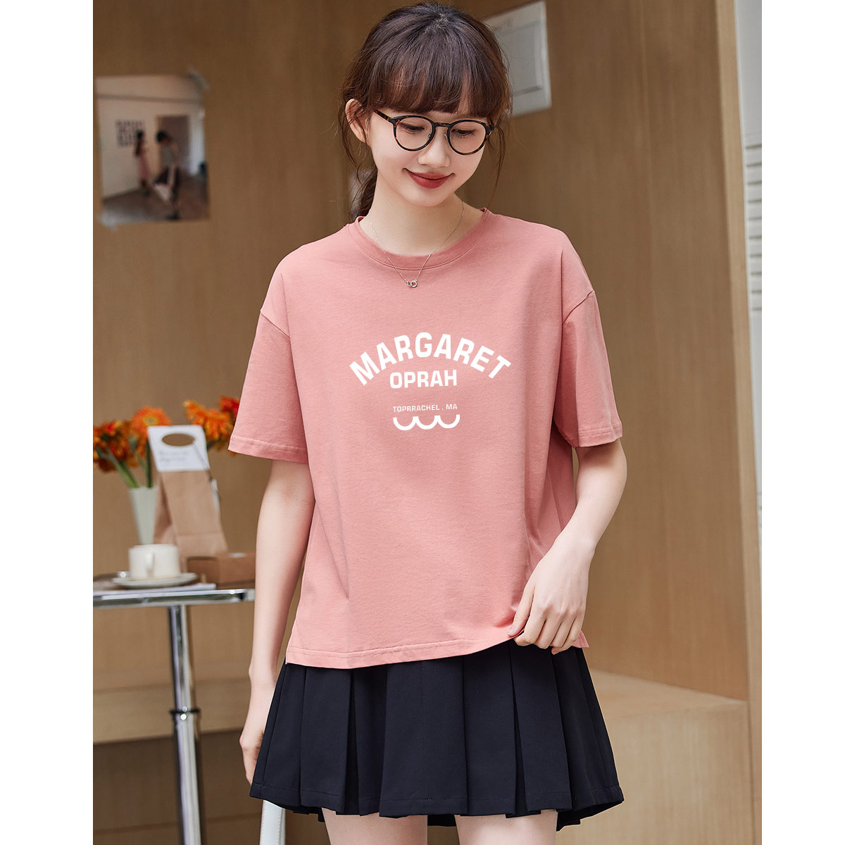 米子旗夏季圆领字母印花女式大码T恤宽松休闲慵懒风短袖上衣 516506