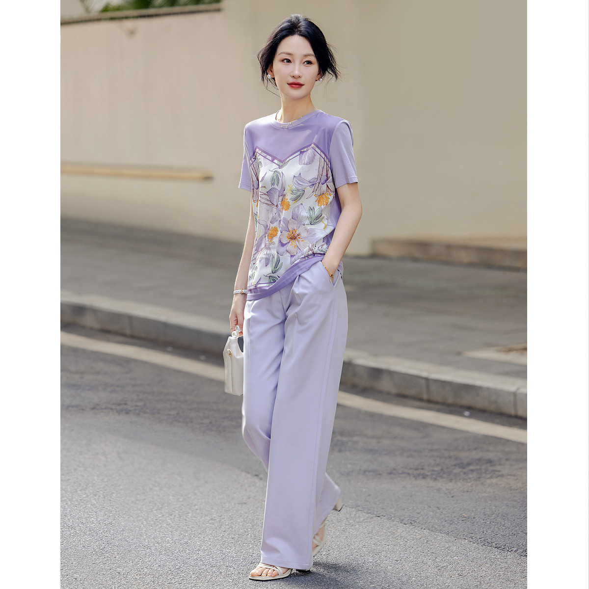 【淡淡清冷女人味】夏轻熟通勤印花拼接舒适棉氨显瘦女式t恤 778497