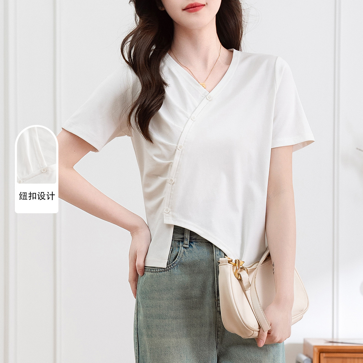 设计独特不规则开叉斜排扣V领夏季短袖T恤女修身短款休闲上衣女 303617