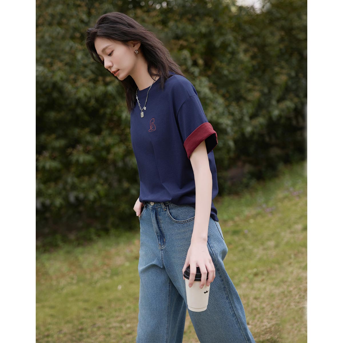【基础款翻边袖撞色T恤】夏款圆领绣花装饰短袖T恤女 943682