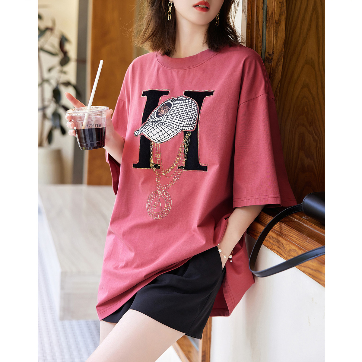【时尚烫钻女式t恤】夏款圆领宽松短袖t恤女中长款 457665
