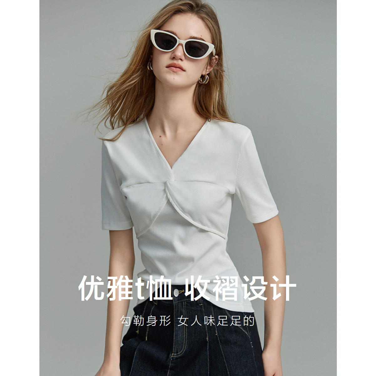 【优雅不败】夏甜辣风V领短袖t恤女前胸收褶紧身棉料女式t恤 842689