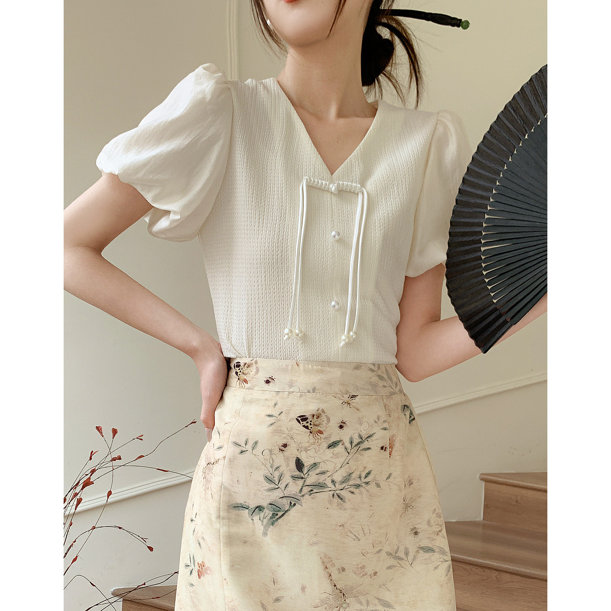 【月白风清】夏季国风新中式V领珍珠盘扣拼接莱赛尔泡泡袖女t恤 984897