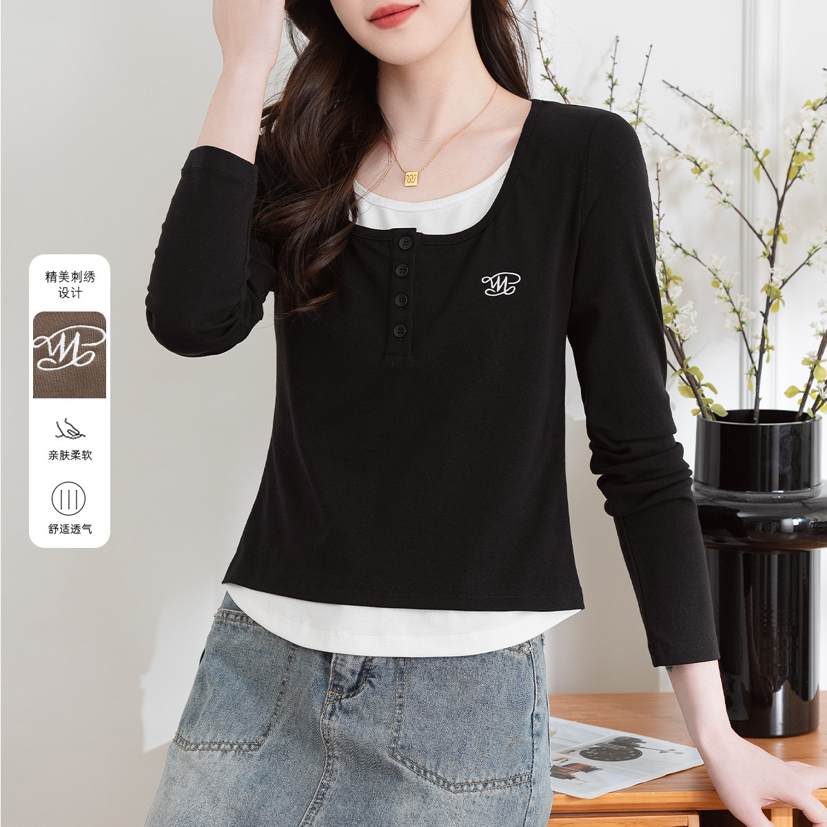 【精美刺绣】冬季长袖假两件T恤女修身舒适时尚休闲内搭外穿上衣 520705