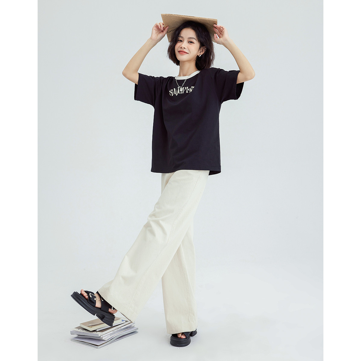 米子旗夏季圆领字母印花女式大码T恤宽松休闲慵懒风短袖上衣 516506