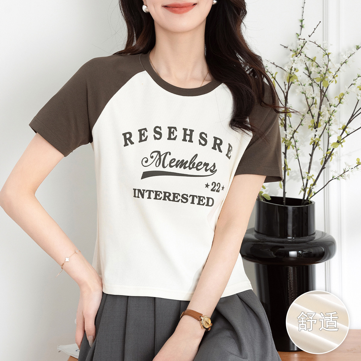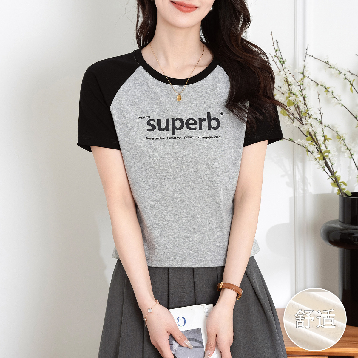 夏季插肩袖短袖T恤女印花独特修身显瘦百搭休闲舒适小个短款上衣 435073