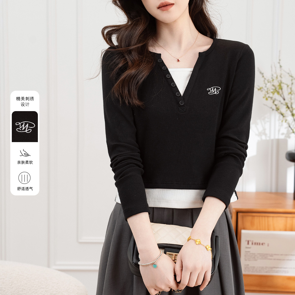 【精美刺绣】冬季长袖假两件T恤女修身舒适时尚休闲内搭外穿上衣 365057