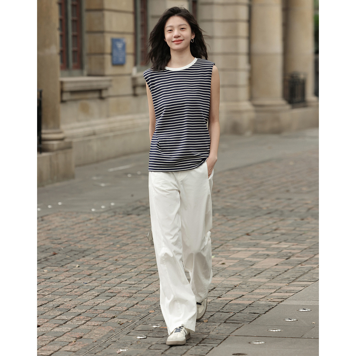 【经典条纹无袖T】夏圆领领子撞色条纹无袖T恤女 626178