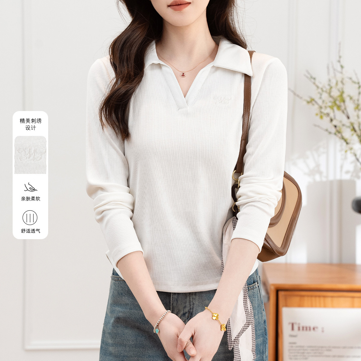 【精美刺绣】长袖半开胸T恤女春秋翻领休闲舒适时尚微弹短款上衣 662017