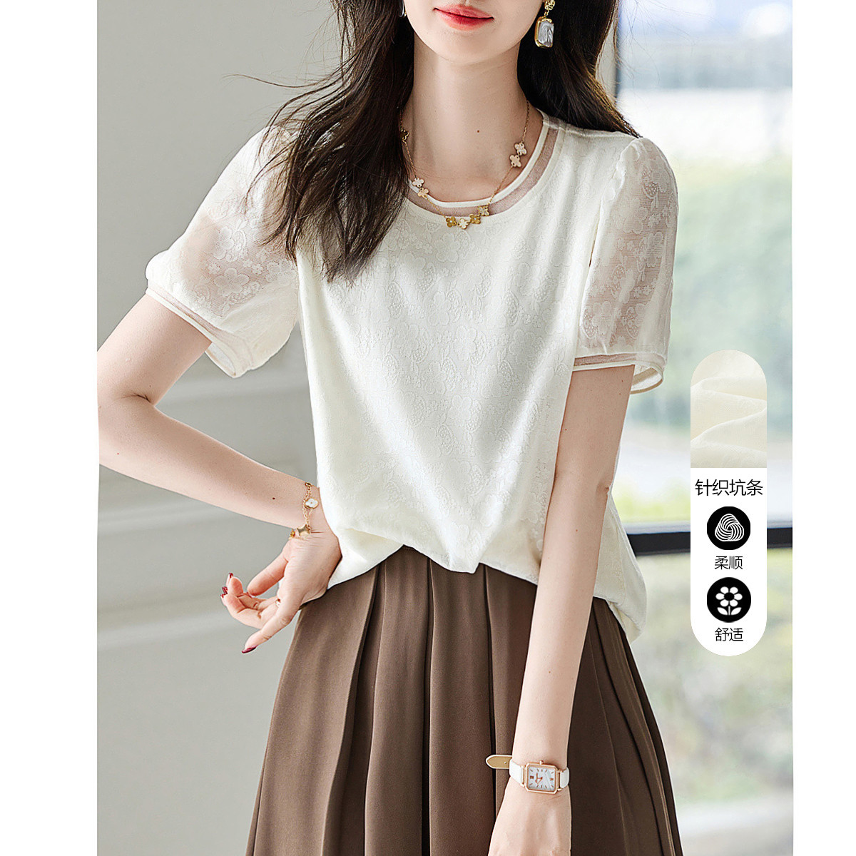 【欧根纱罗纹圆领】夏优雅仿蕾丝镂空针织短袖t恤女泡泡袖女式t恤 692225