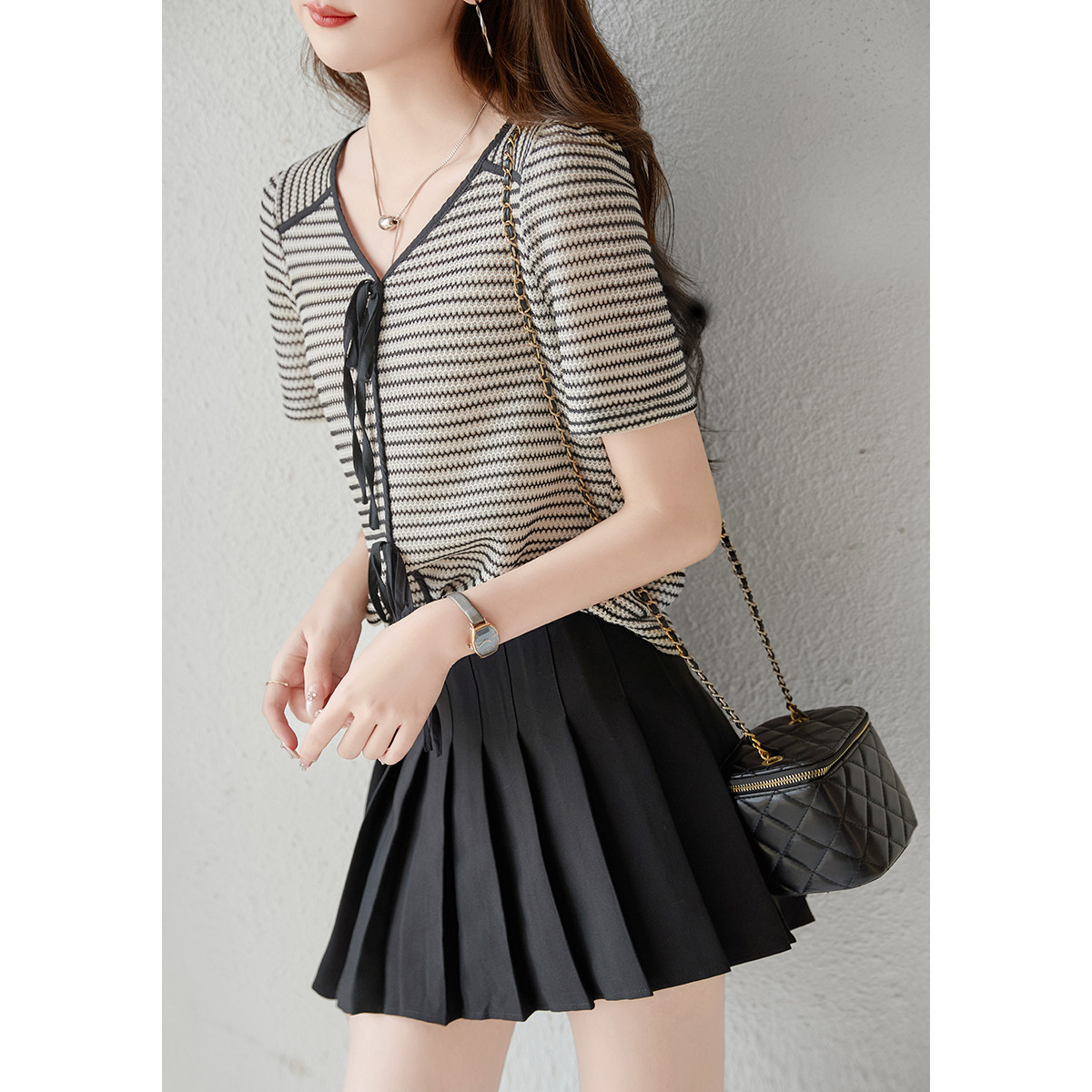 【法式图鉴】夏撞色V领短袖t恤女蝴蝶结下摆开衩肌理感女式t恤 968513