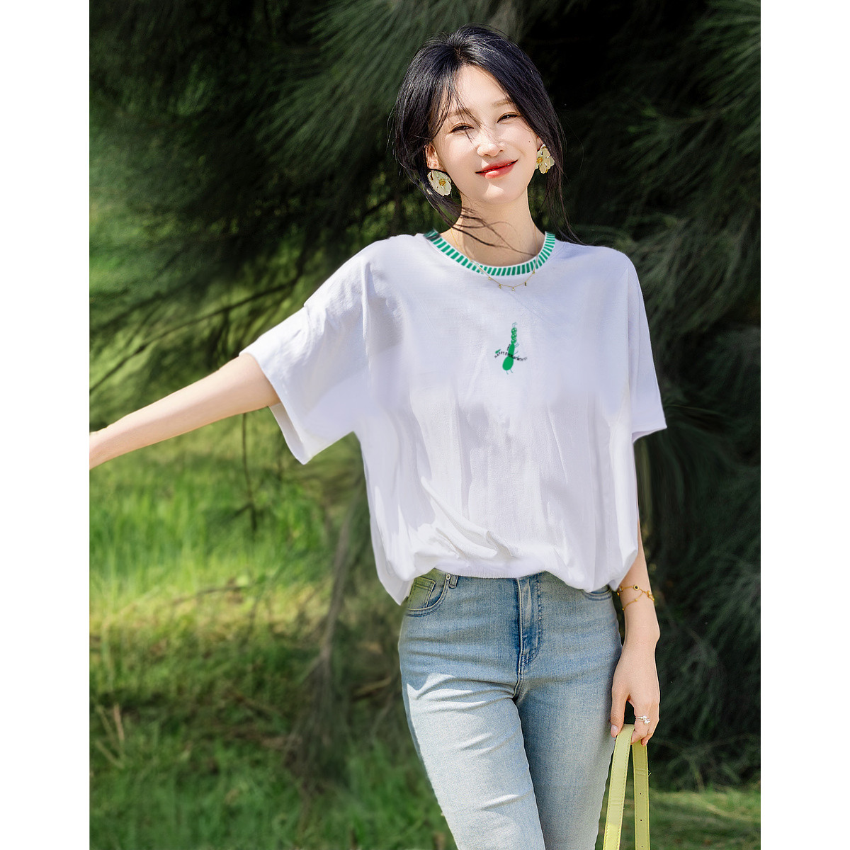 【复古情怀】夏季圆领条纹撞色短袖t恤女刺绣时髦舒适女式t恤 912065