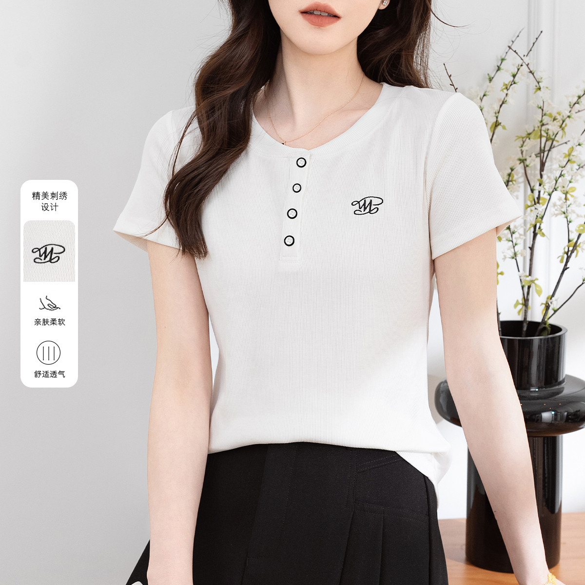 夏季爆款刺绣开胸短袖T恤女微弹舒适修身透气时尚休闲上衣女潮 678401
