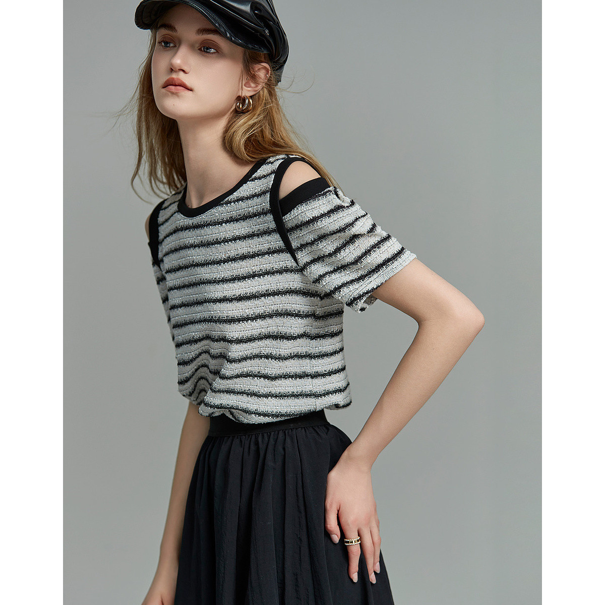 【时髦设计感露肩】夏都市通勤活力条纹t恤肌理质感女式t恤 355841